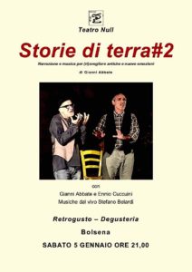 Primo appuntamento del 2019 per il Teatro Null, Officina culturale della Regione Lazio I porti della Teverina, sabato 5 gennaio alle ore 21,00 presso Retrogusto – Degusteria a Bolsena, arriva una versione molto particolare dello spettacolo di Gianni Abbate “Storie di terra”, con l’aggiunta dell’aggettivo ghiotte. Giunto alla sua quarta edizione, arricchito di nuovi racconti, ci riporta, tra musica e narrazione, in mondi non lontani, anzi vicinissimi, dove il ritmo naturale era ancora presente in noi e i rapporti sociali erano improntati al massimo rispetto e alla solidarietà. Un viaggio poetico, emozionante, ironico, che attraversa ed esplora il mondo contadino di una volta. In questa edizione speciale con l’aggiunta dell’aggettivo ghiotte, proprio perché ambientata nel locale di Roberta Perosillo, dove gli spettatori/commensali, degustando semplici prelibatezze della casa, ascolteranno storie e aneddoti di vita contadina, di come si faceva il pane o il vino, quelle stesse storie che si raccontavano la sera a veglia dai vicini. Durante la serata si potrà godere anche di ‘ghiotte’ musiche, canzoni e filastrocche di una volta.