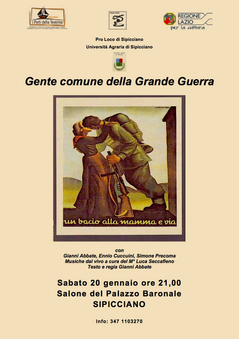 Il Teatro Null, Officina culturale della Regione Lazio I porti della Teverina, presenta, sabato 20 gennaio ore 21,00, nel salone del Palazzo Baronale di Sipicciano, “Gente comune della Grande Guerra”. Lo spettacolo vuole, attraverso la fitta corrispondenza da e per il fronte, dar voce a quanti sono stati coinvolti nella Grande Guerra. Per la prima […]